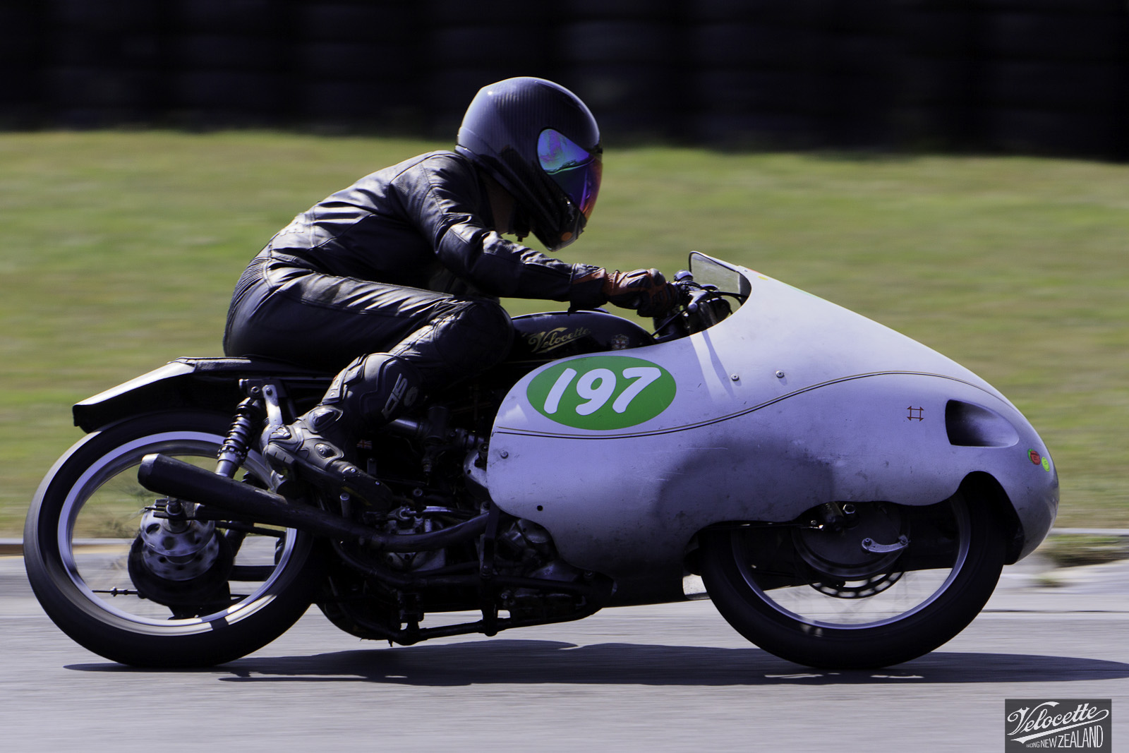 Phil Price riding a girder fork 1930s Velocette MOV approaches the hairpin in a Hampton Downs Summer Classic 250 Clubman’s race. The MOV were renowned in the day for their innovative “dustbin” fairing.