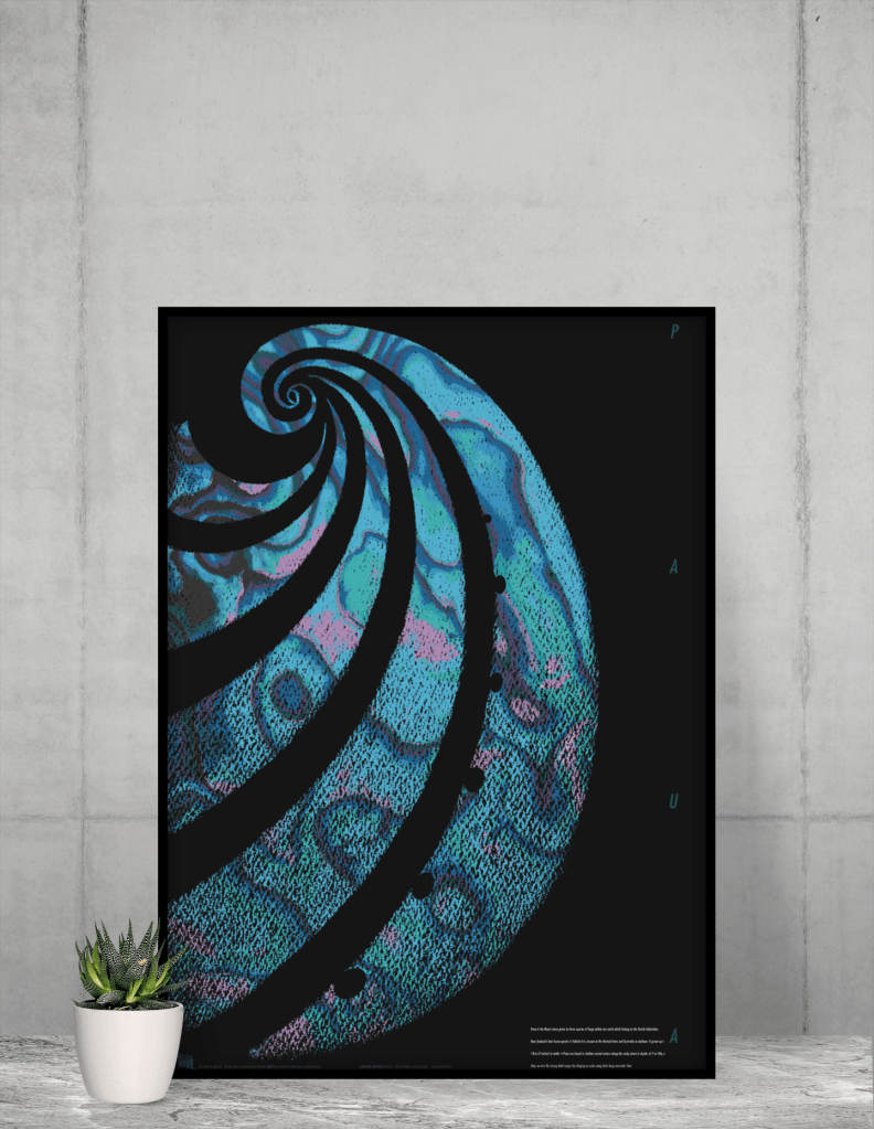 This art print is a composite of a charcoal drawing and hand-separated paua shell pattern printed in 6 colours which gives the paua design a shimmering quality. Illustration based on a photo by Rod Morris.
