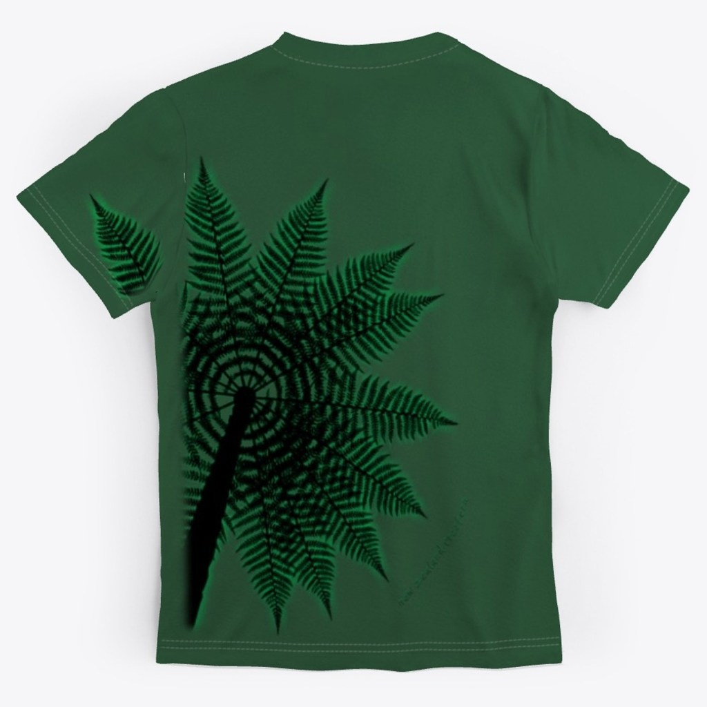 Feel like a walk in the forest downunder? It’s hard to avoid the familiar sight of tree ferns, or punga, no matter where you go in New Zealand. Cool and bushy, this attractively umbrellarific all-over printed t-shirt design is repeated on the shirt back. Available in adult sizes XS–3XL on forest green or black shirts.