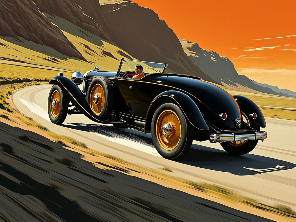 For example, first taxi off the rank, producing a Norman Rockwell style Saturday Evening Post illustration and a Gustav Klimt Art Nouveau Style portrait creating a fusion of art and history. The AI assisted digital illustration process allowed for the freedom to quickly render a variety of visuals of the car illustration, where I could experiment with action-packed images of the car in motion in various settings in the era and artistic styles. The end goal is to make a skilled photo-composite of the client’s car merged into the AI generated eye visualisations.