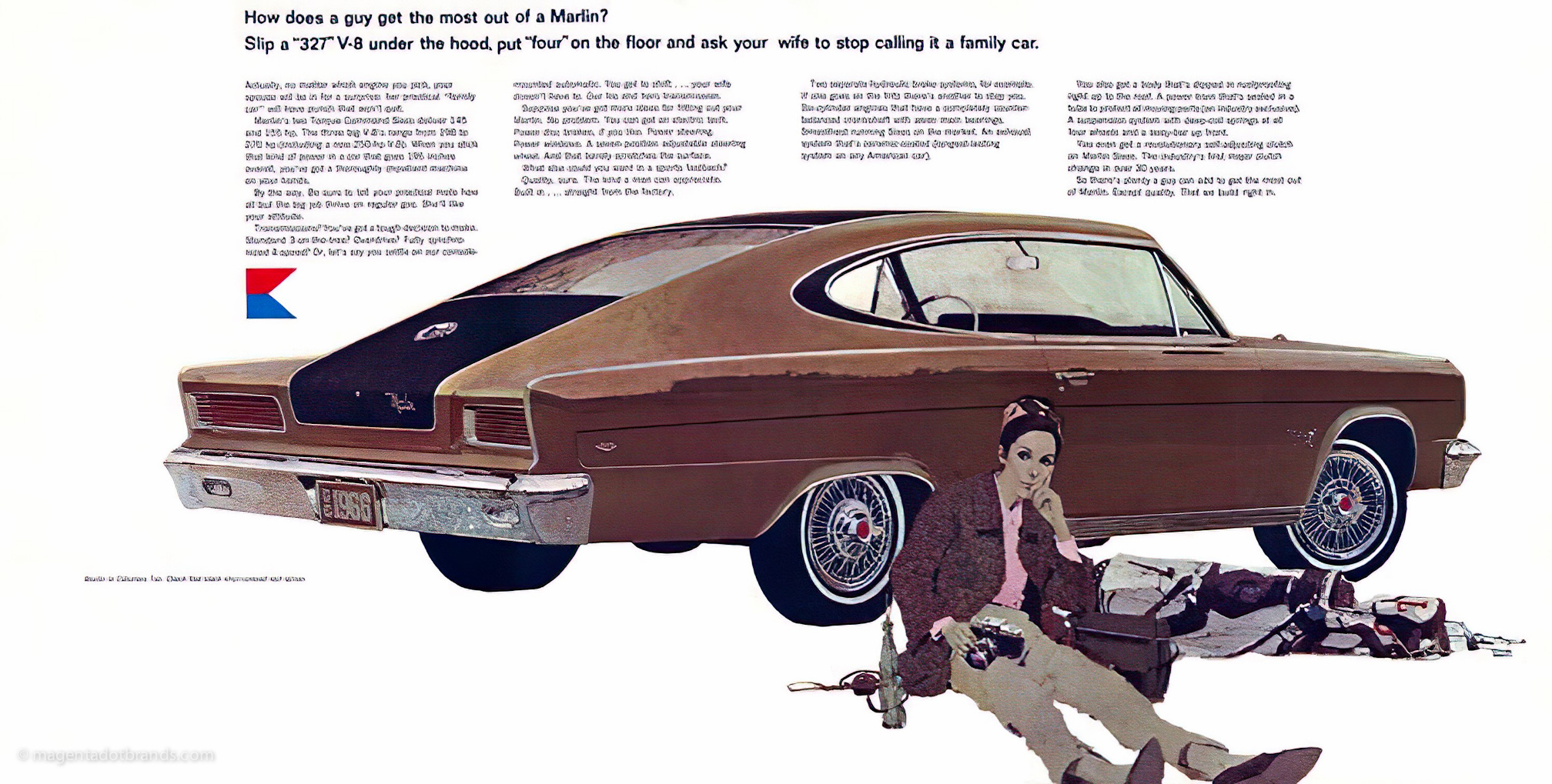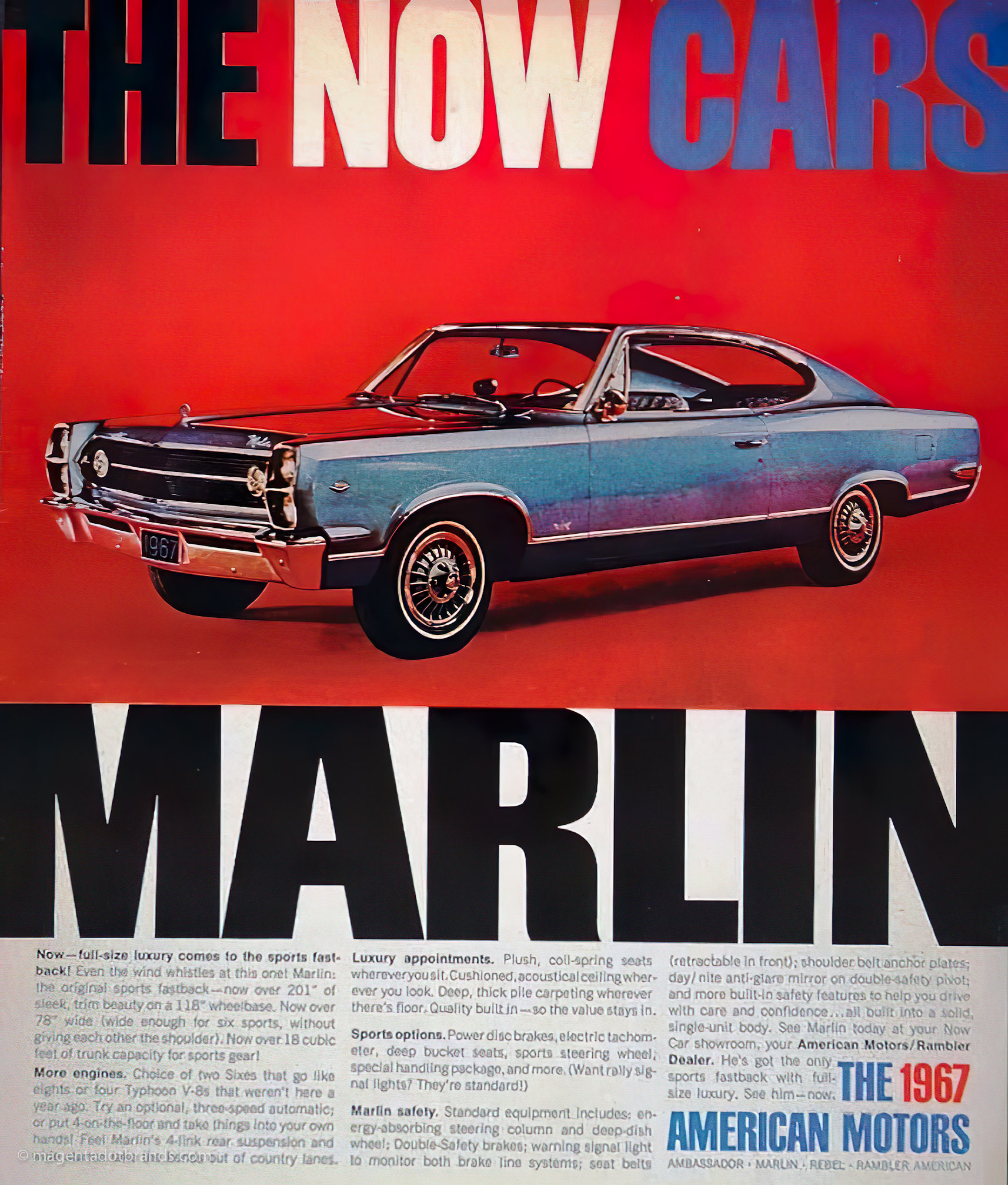 Hey there! I’m just starting a project that’s close to my heart as a child of the 60s and a Graphic Designer. It involves a big, flashy 1967 American Motors car, the Marlin. This two-door fastback car produced by American Motors Corporation (AMC) from 1965 to 1967 is not your everyday car. The automakers really wanted to make something special, something that stood out. That’s how the 1967 American Motors Marlin was born. It came equipped with a powerful 343 cubic inch V8 engine to boot, which was a statement in itself. It was initially launched as the Rambler Marlin in 1965, but in 1966 and 1967 it was rebranded as the AMC Marlin.