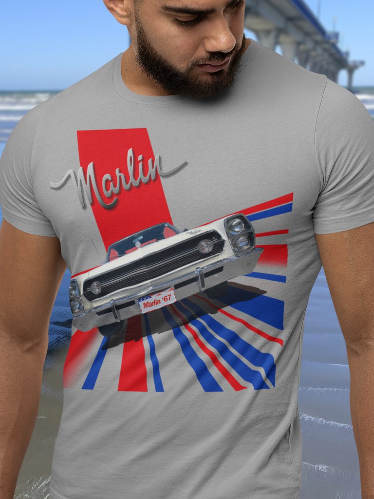 Immerse yourself in the vibrant world of classic American style. Explore our latest t-shirt collection, inspired by the sleek lines and bold statement of the 1967 American Motors Rambler Marlin. These shirts capture the essence of this iconic fastback. They blend the car’s dynamic design with American Motors’ advertising from back in the day. The spirited energy of New Brighton’s pier and beach is also woven into the design. Our models showcase these vibrant tees, where the red, white, and blue aren’t just colours—they’re a statement. Whether you’re cruising the coast or strolling by the shore, these shirts offer you a piece of automotive history. They have been reimagined for everyday wear.
