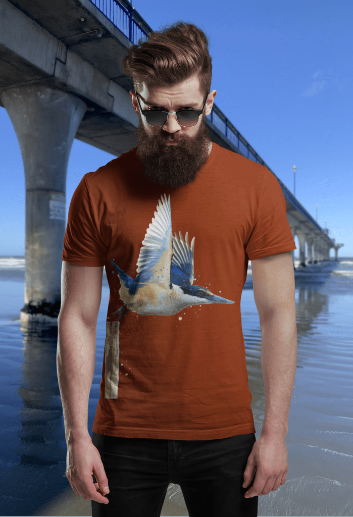Kingfisher Rising on a rust colour t-shirt.Kingfisher Rising on a tan colour t-shirt.Kingfisher Rising on an aqua colour t-shirt.Kingfisher Rising on an aqua colour t-shirt.Kingfisher Rising on a black t-shirt.