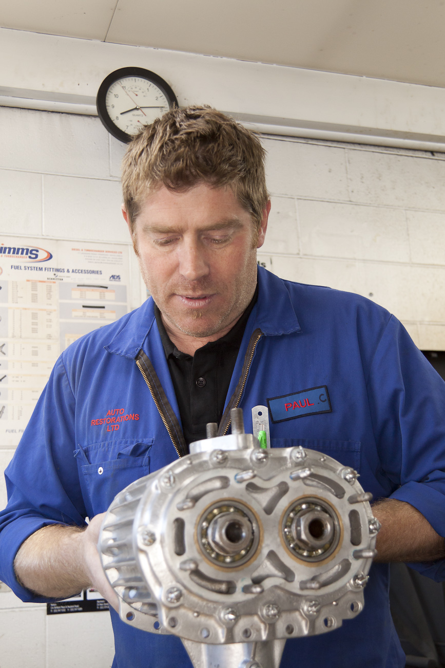 Paul Costin works on a re-created classic 1930s Alfa Romeo supercharger in the Mechanical Shop at Auto Restorations.