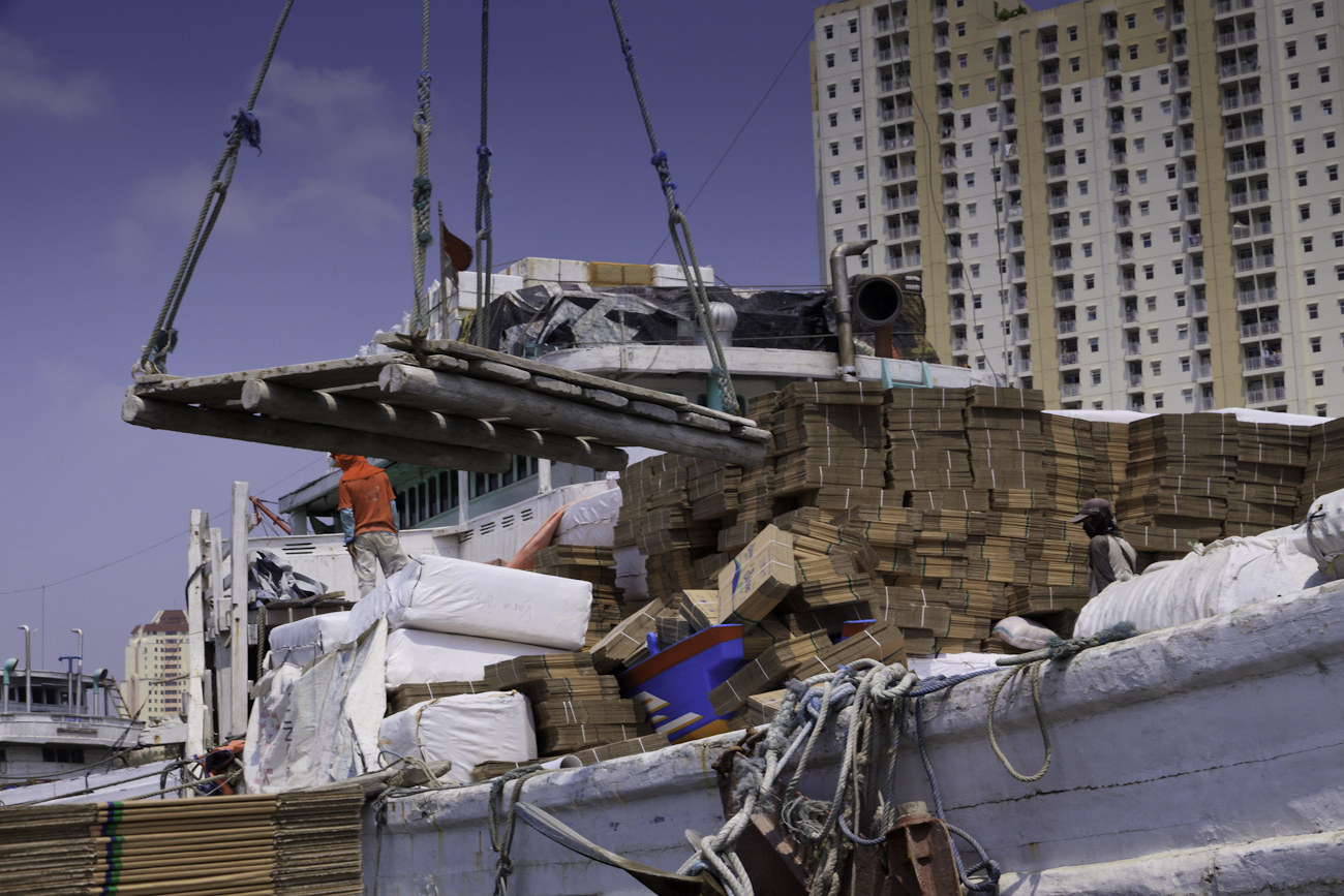Pinisi freighter deck crane cargo operations, empty crane lifting platform returns to deck of freight truck for the hand loading of another load of cardboard flat-packed boxes.