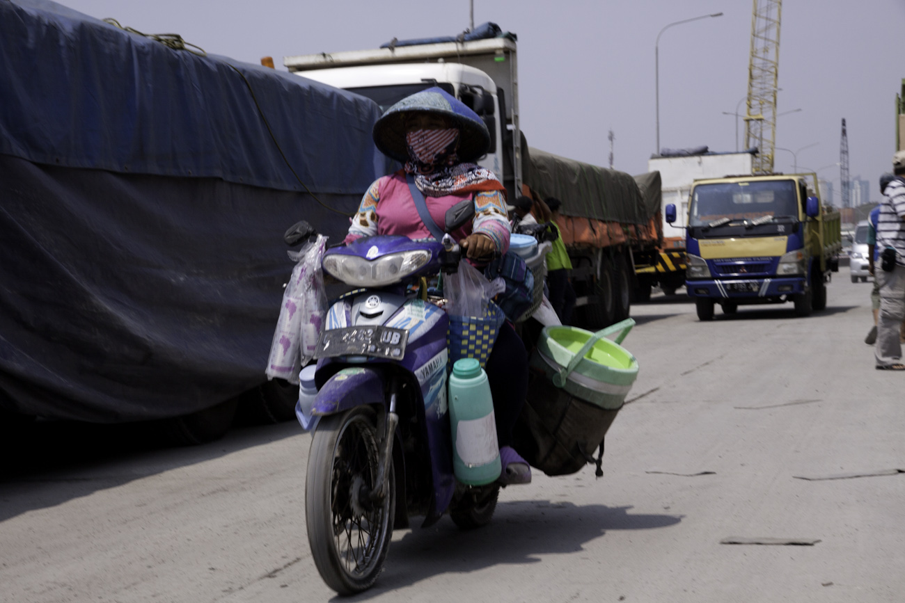Mobile cafeteria on a scooter motors down the wharf at the old port of Sunda Kelapa, Jakarta, Indonesia.