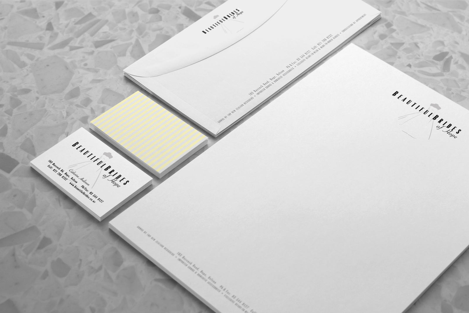 Beautiful Brides of Hope bridal couture business stationery system, letterhead, envelope and business cards, an elegant, finessed presentation of the brand in print. The logo features a pairing of refined and simplified bridal illustration integrated with elegant type that create an integrated singular brand expressiona. As part of the brief the exuberant Beautiful Brides of Hope name was developed by MagentaDot Brands, a play on the fact that the business was run from a studio at the client’s home in Hope, Nelson, New Zealand. Brand naming, Brand and identity systems design, Illustration, icon design, print production.