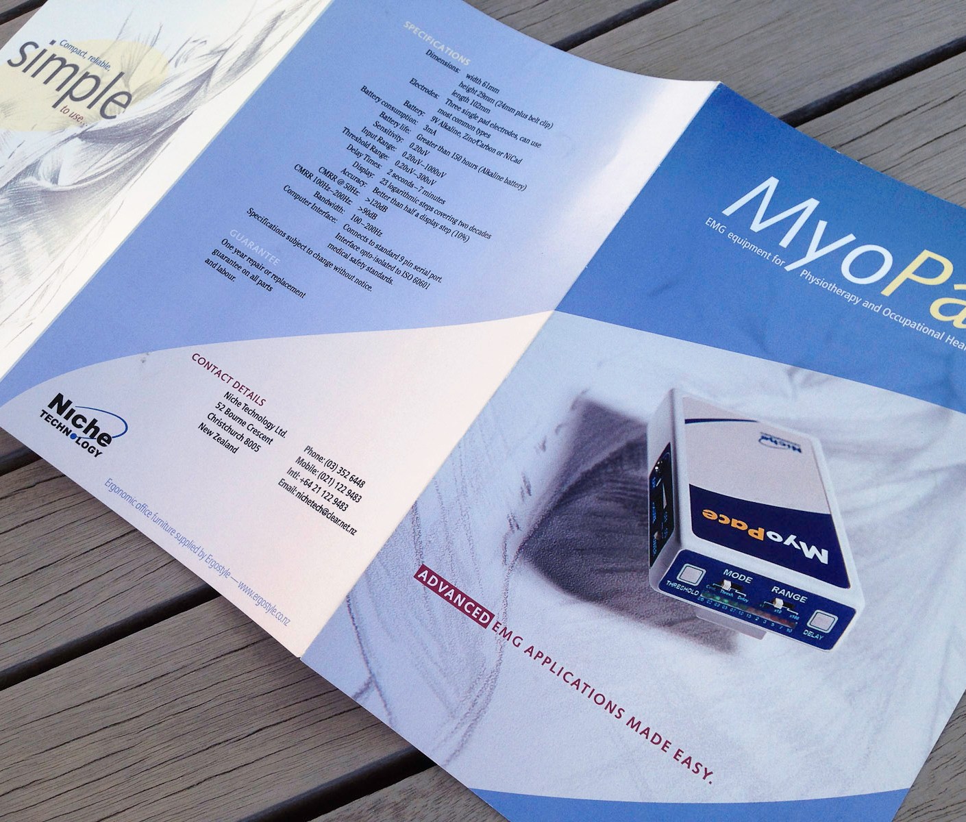 The MyoPace EMG product capabilities brochure presents the utility of a high tech piece of medical equipment beautifully and inexpensively. The brief was for a product brochure makeover. A plain sheet of paper is transformed into an engaging, easy-to-read A5 three-panel brochure with full bleed printing and two rollover folds.