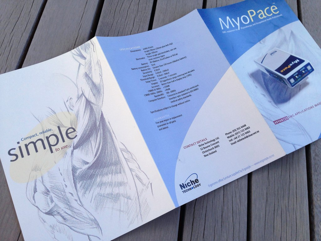 MyoPace: EMG equipment for Physio & Occupational Health Pros. The brief was for a Hi tech product brochure makeover.
