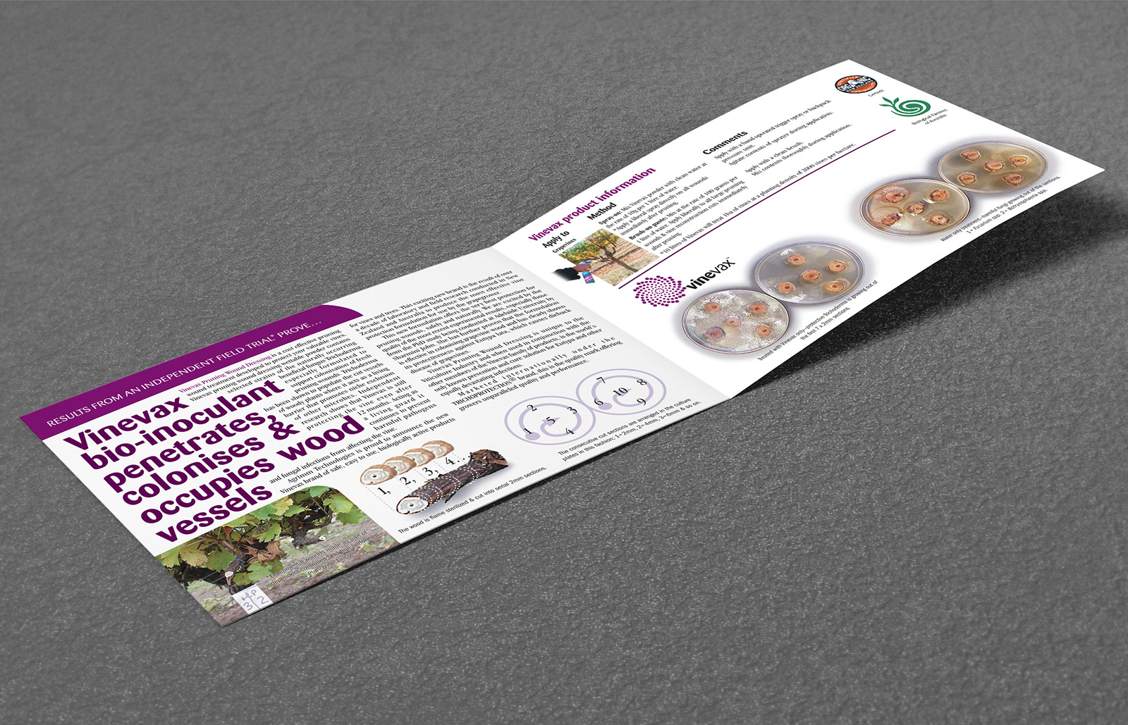 Inside spread. Vinevax “Pruning wound dressing” living barrier wound dressing for vines, A5 landscape brochure.