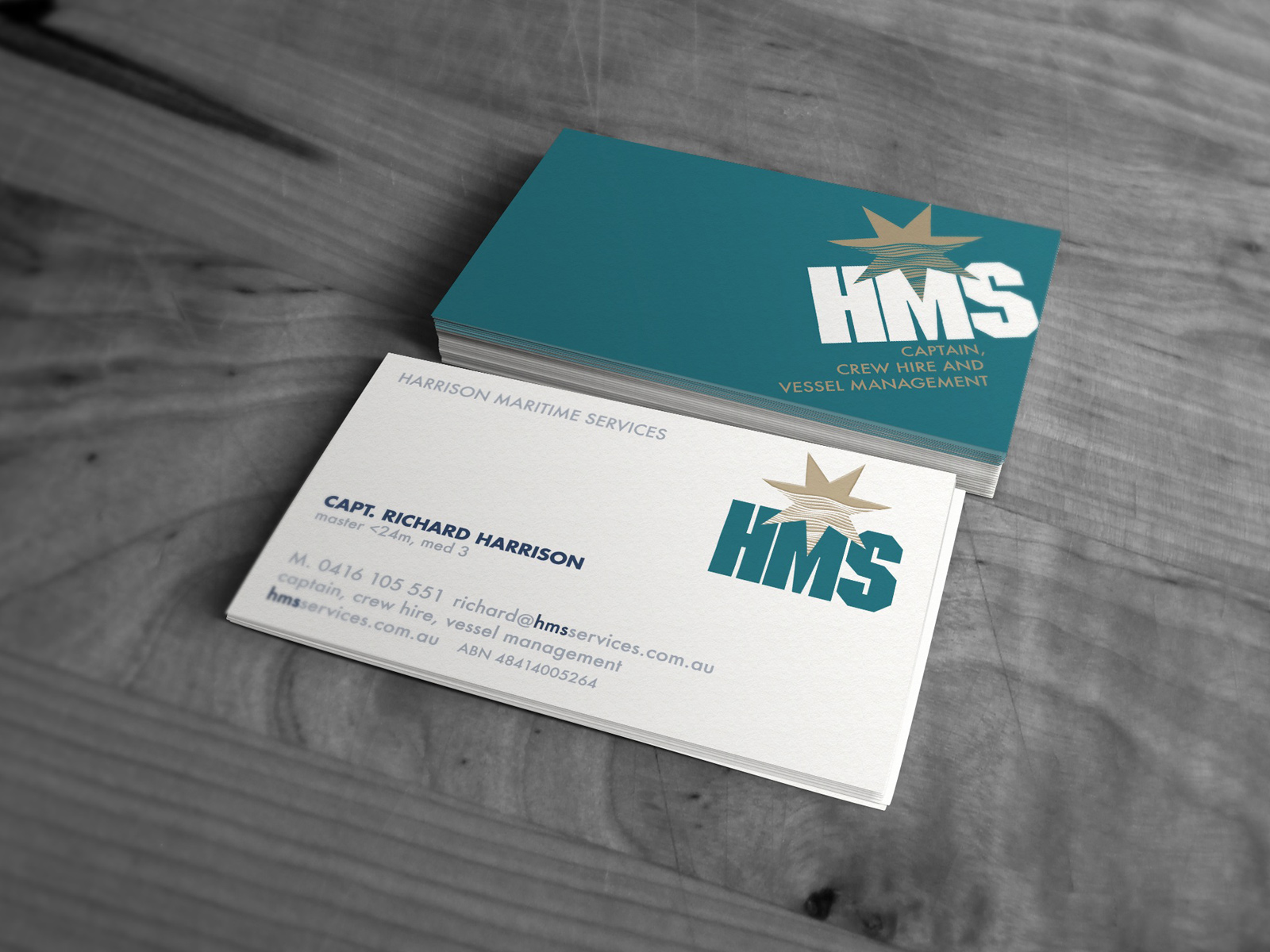 Stacked Harrison Maritime Services “HMS” business cards showing both sides of the card.