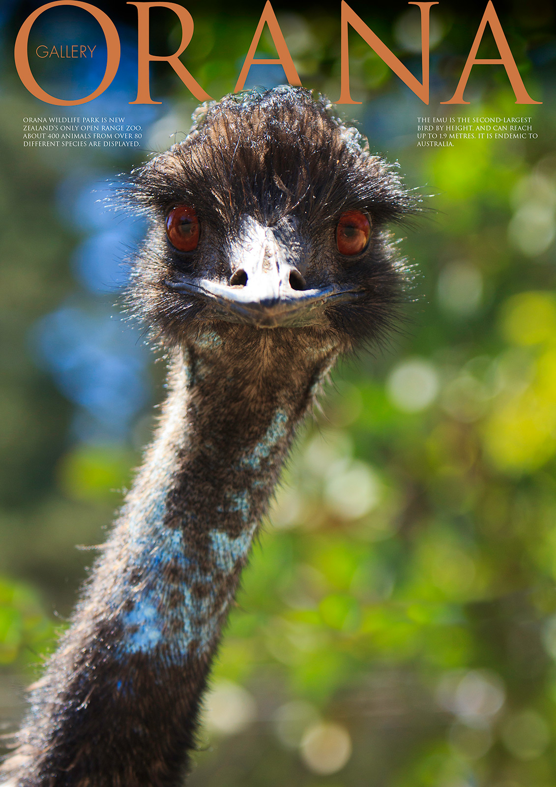 Wildlife Photo portrait of an Emu at Orana Park, New Zealand’s only open range zoo.