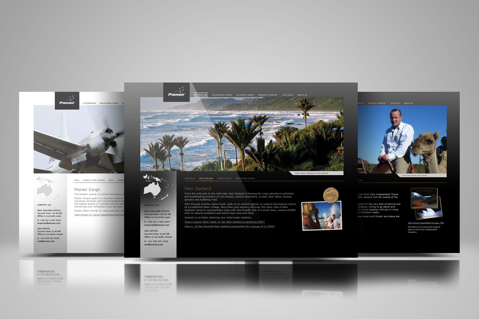 Pionair.com website, New Zealand / Destinations / New Zealand page, West Coast scenic photo centre, Pionair Air Cargo page to the left, Tailormade travel page to the right.
