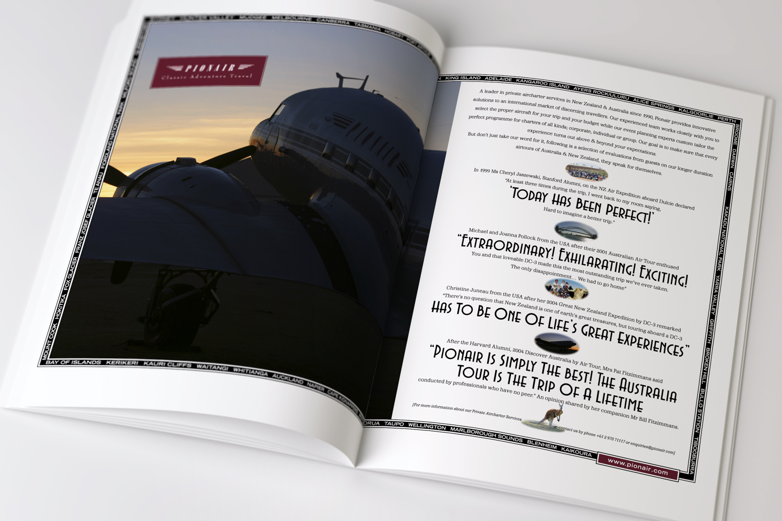 Golden Era of Air Travel / Circumnavigation of Australia by Classic DC3 Airtour double page magazine advertisement. The second ad in a 3 ad campaign.