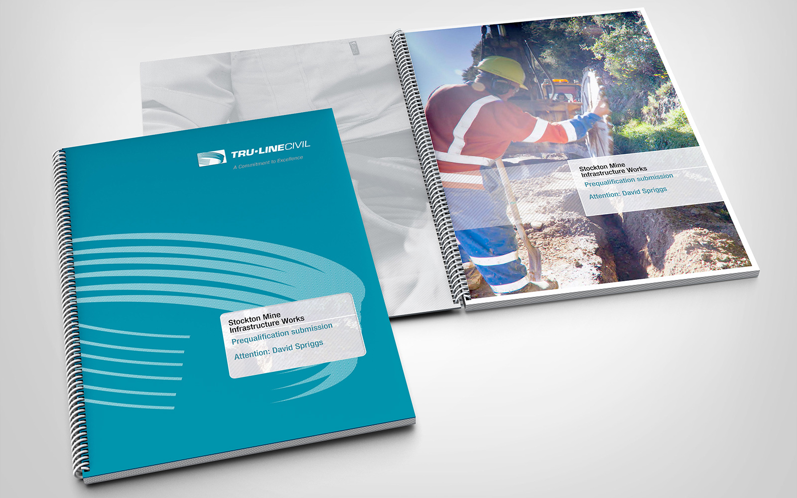 Tru-Line Civil bid document booklet. Part of the corporate stationery system, the content of the wire-o bound booklet is based on a custom word document template, the cover page of which is visible through the die-cut folder cover window.