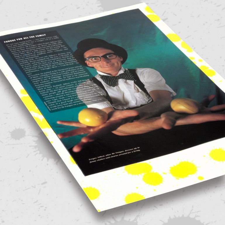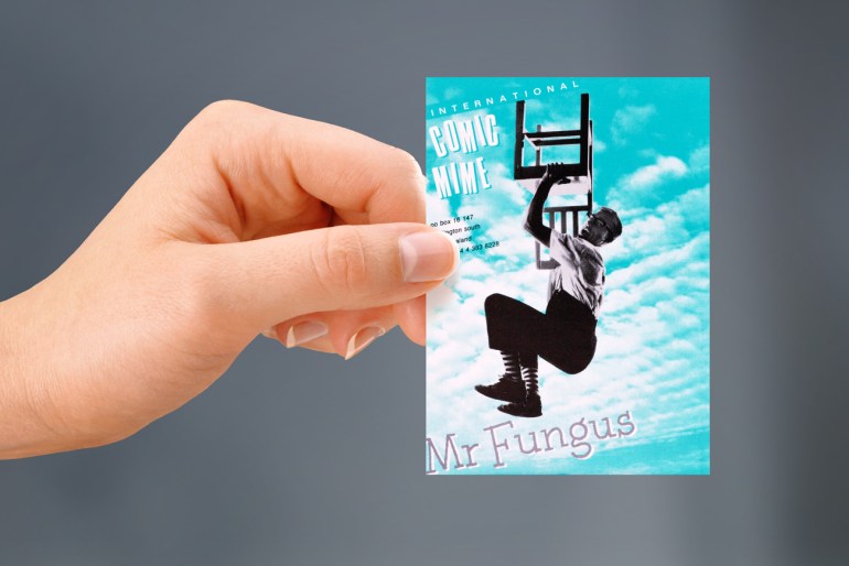 Recently returned to settle back in Wellington from the U.K. in 1991, having done his time entertaining Covent Garden and international festival audiences, Fergus Aitken was a busker, a young exponent of clowning, juggling, mime and the bizarre who needed a logo and a business stationery promotional kit to advertise and promote his comic mime character Mr Fungus. More broadly he needed to promote his availability for various performing arts roles and as a mime workshop teacher in community, school and tertiary education settings. The first project, a card, would be handed over personally or included in direct mail campaigns to various audiences, where it would be viewed mainly at very close range.