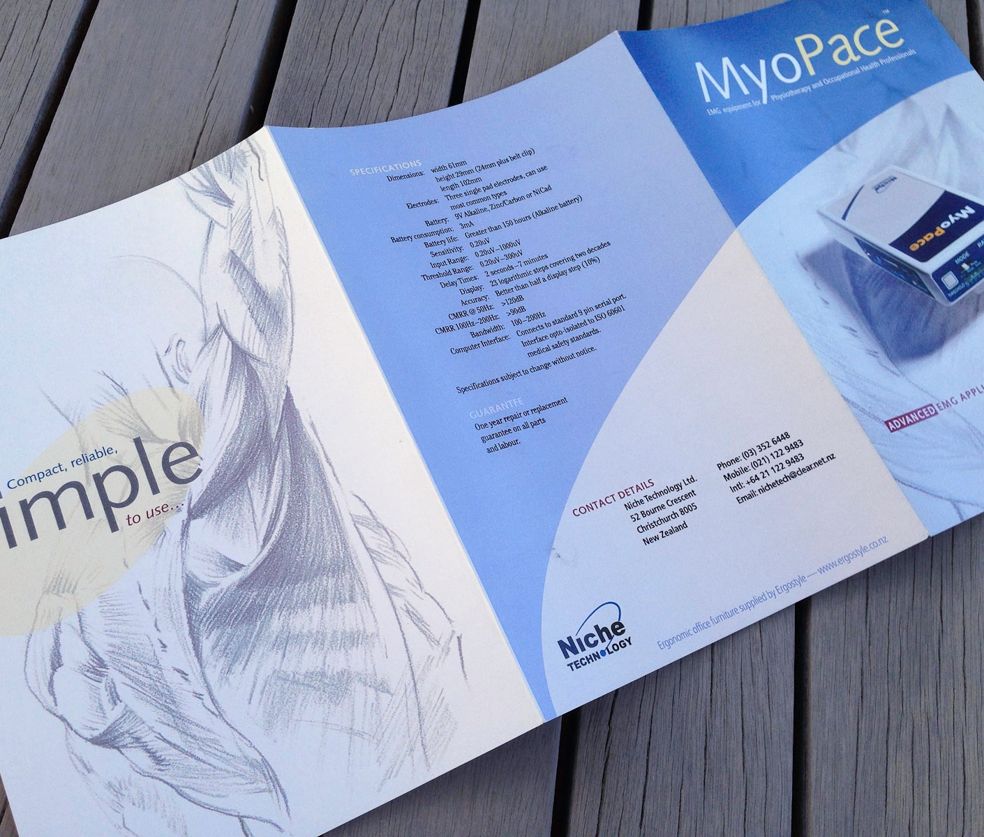 The Niche technology EMG (Electro Myograph) brochure was direct mailed to physiotherapists in New Zealand and abroad, given out by hand, displayed at trade shows for customers to take and distributed to their wholesale customers. This capable feature-packed device represented high performance and great value for money and was successfully retailed and wholesaled by Niche technologies at trade shows domestically and internationally.