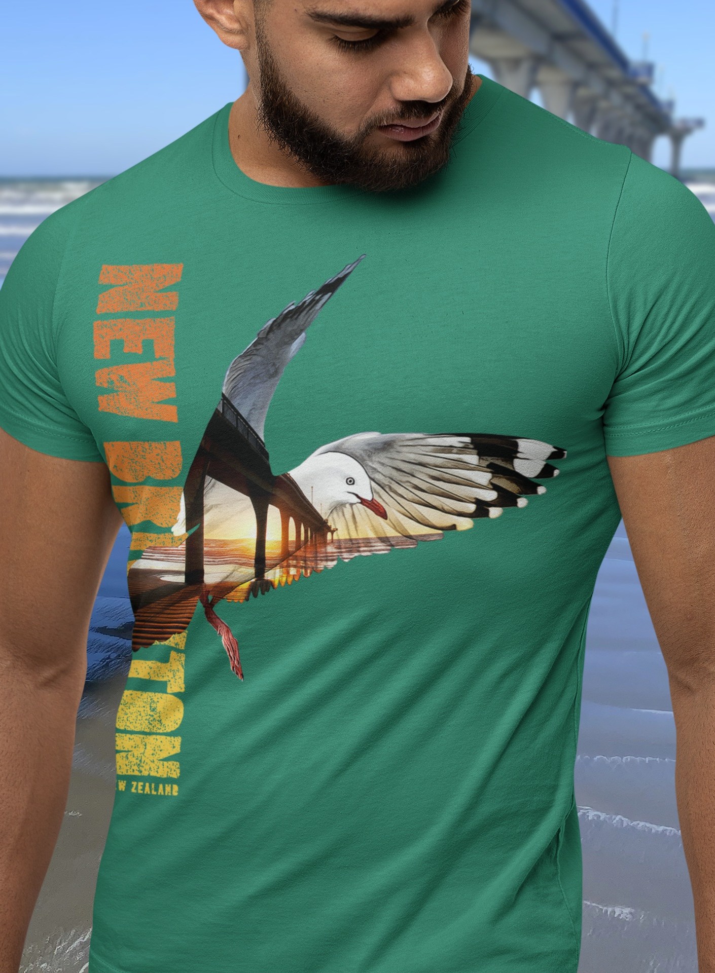 Celebrate the charm of New Brighton beach and the pier with this red-billed gull sunrise T-shirt! Crafted for comfort and style, this tee captures the essence of local wildlife and the beach with its colourful depiction of New Zealand’s iconic tarapunga and New Brighton Pier. Perfect for locals and tourists alike looking to take a piece of the seaside back home.