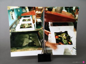 With our layered or hand-separated multicolour designs the colour is laid down in areas with the hand-pulled silk-screening process, with “flash-curing” of the print between colour passes, in some cases up to 10 passes to print one garment, front, back, hem and sleeves, one colour at a time.