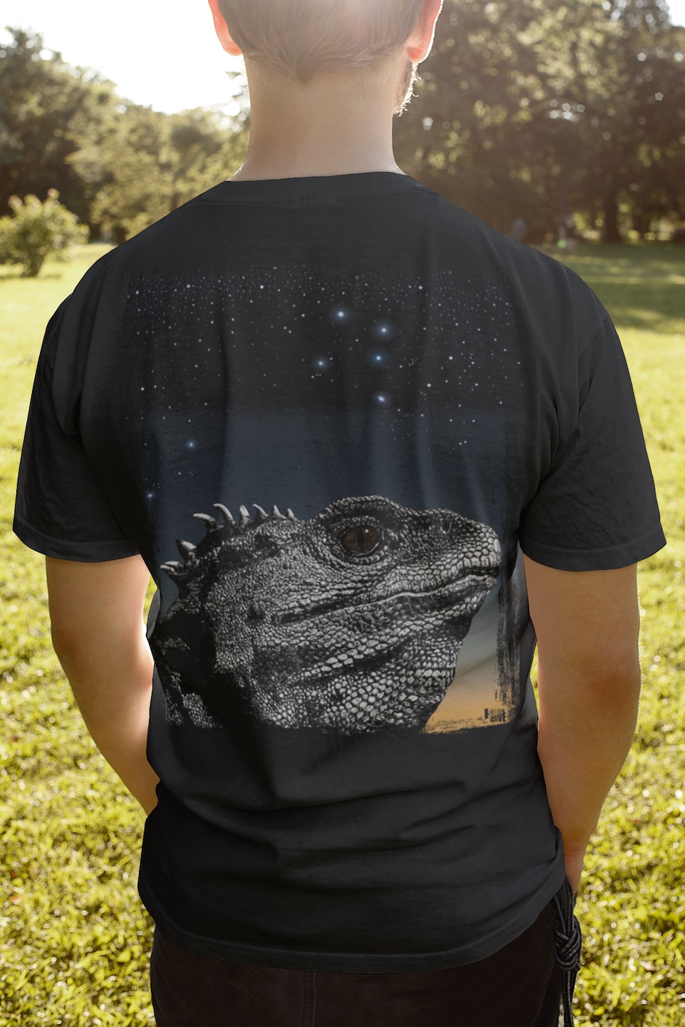 This multicolour, two-sided Tuatara New Zealand t-shirt features an original pen and ink drawing by Shaun Waugh. The portrait depicts the tuatara beneath the ancient light of the stars of the southern hemisphere, centred on The Southern Cross. The original drawing was rendered in pen in fine detail so this art print has the look of real reptile skin. In the background is the coast of Stephens Island, the tiny off-shore island in the Marlborough Sounds that has been a sanctuary for the Tuatara, New Zealand’s living fossil, that has been extinct on the mainland for over a century.