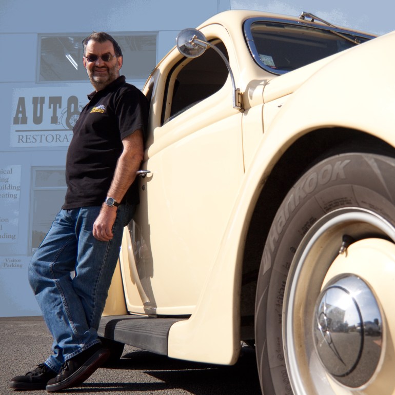 Informal portrait of Allan Wylie, Auto Restorations’ manager leaning against his 1938 Ford roadster.