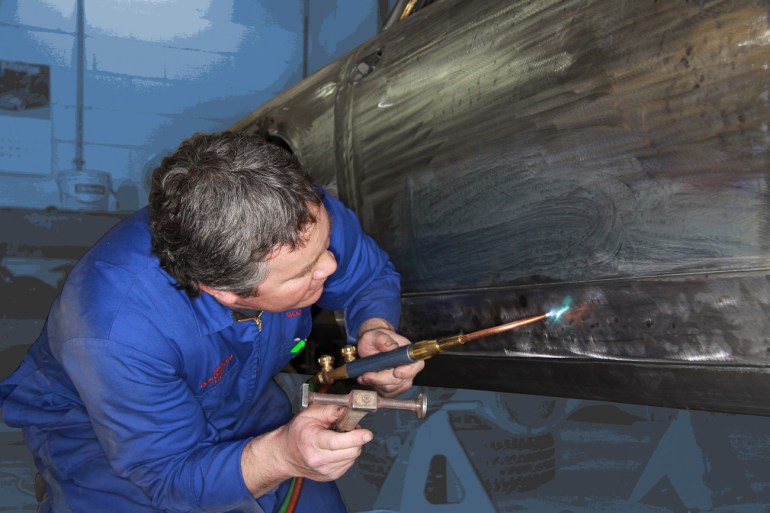 Bob Sterling plies his skills precision fitting a new bespoke aluminium panel, that was fabricated in-house, onto a classic Ferrari restoration in the Panel Shop.