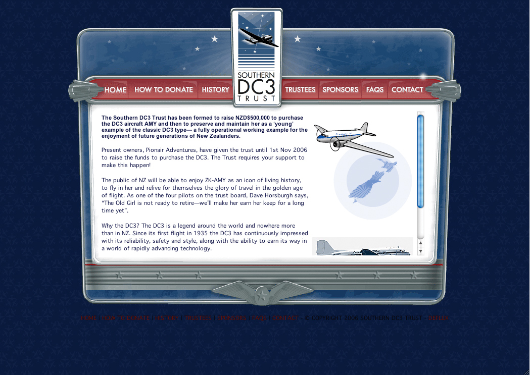 The streamlined retro moderne design theme of the Southern DC3’s branding was consistently applied to the fundraising website. Jono of Deflux did a top job.