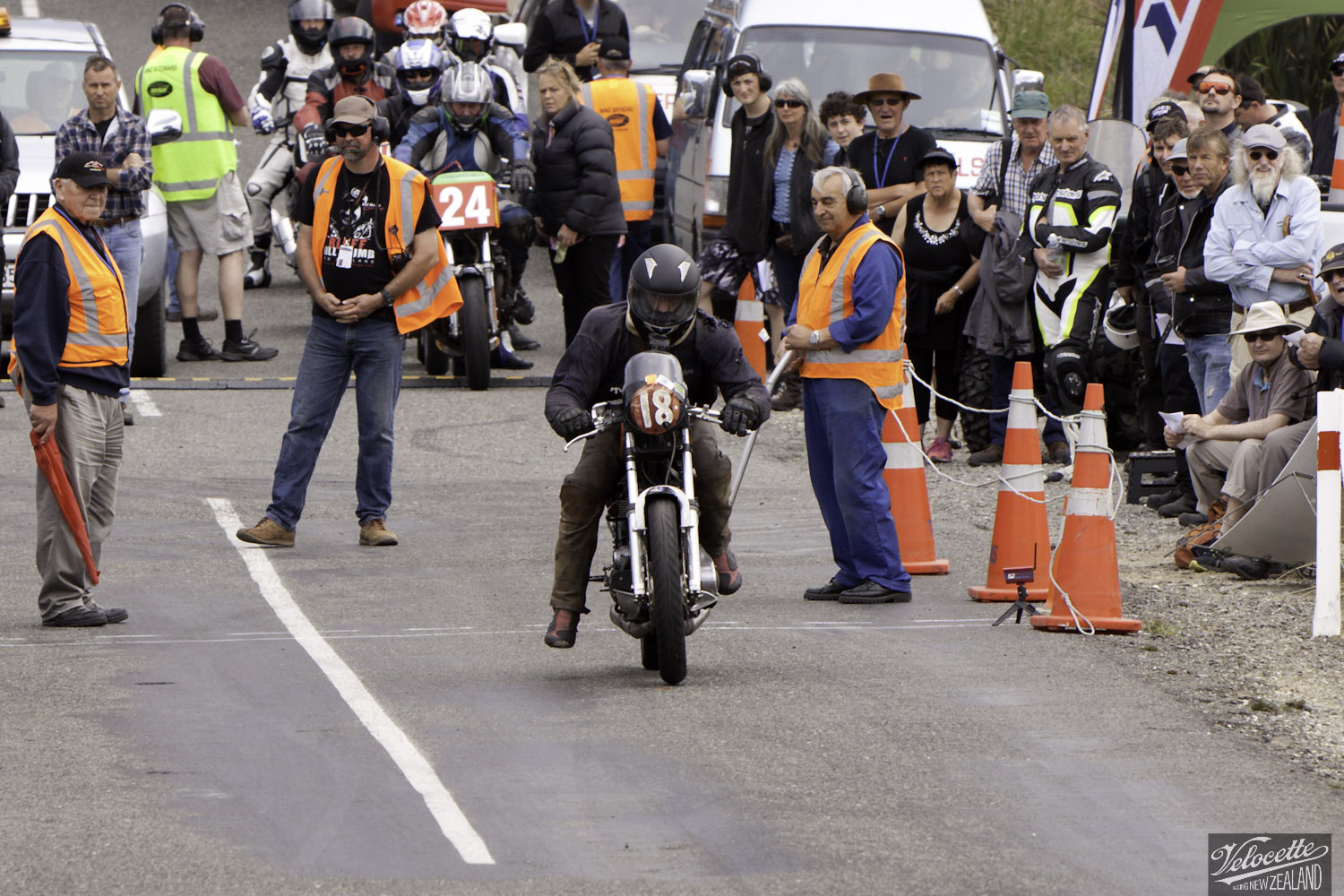 Bluff HIll Climb, Burt Munro Challenge, Kevin Ryan, Motupohue, New Zealand, NZ Hill Climb Champs, Rider 18, start finish line, Triumph Bonneville 800