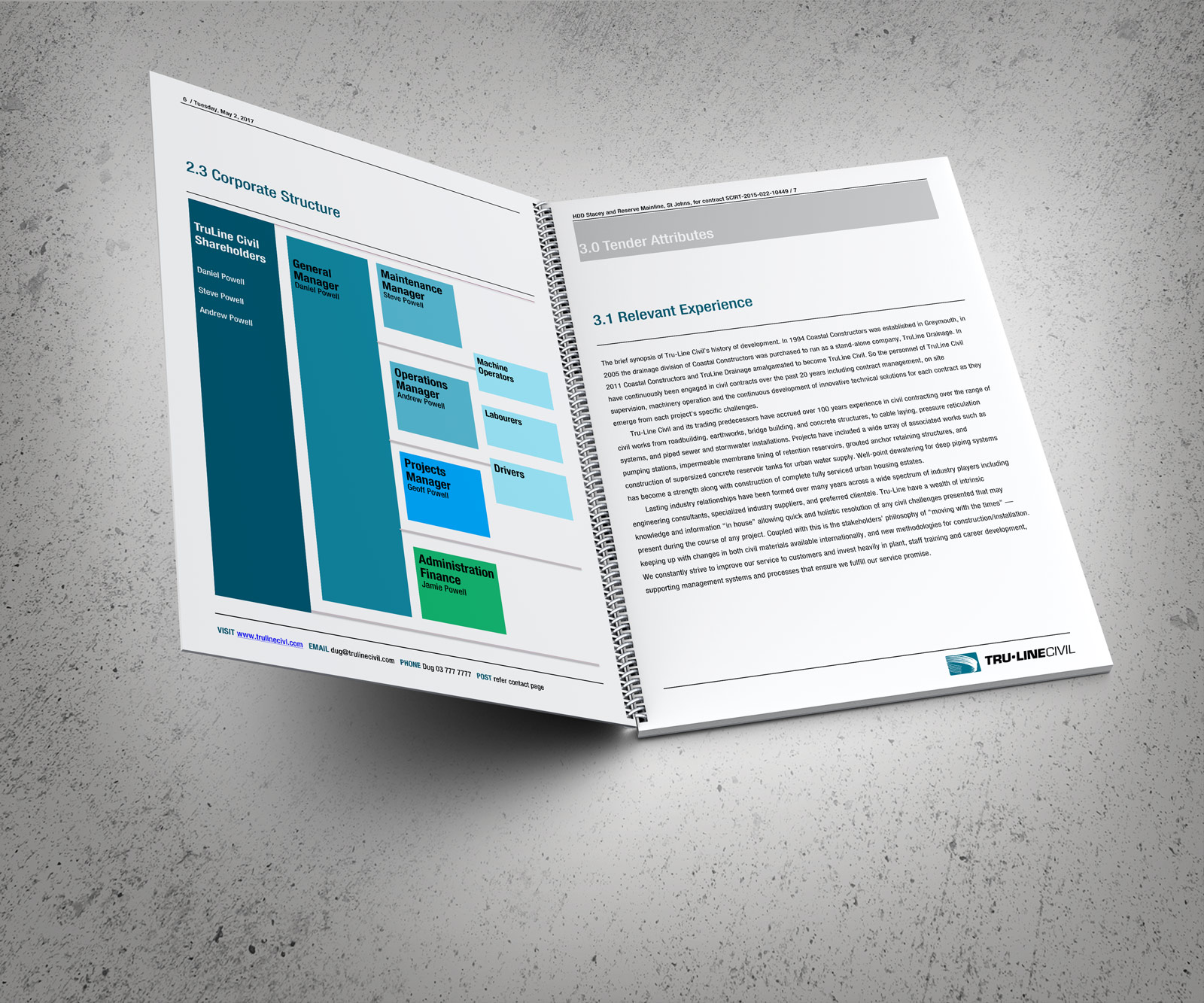 Corporate Structure, Relevant Experience spread. TruLine Civil Tender bid document. Custom MS Word template.