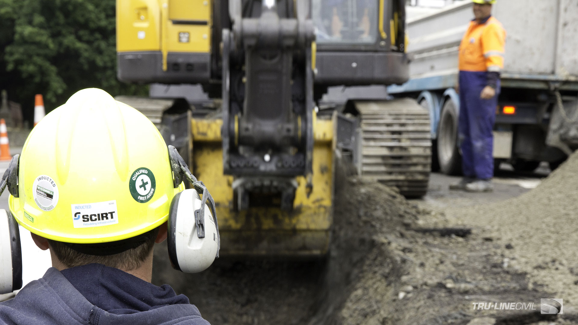 TruLine Civil excavating new water main in Barbadoes Street, central city in 2014. Part of the central city rebuild.