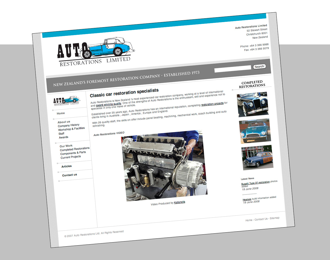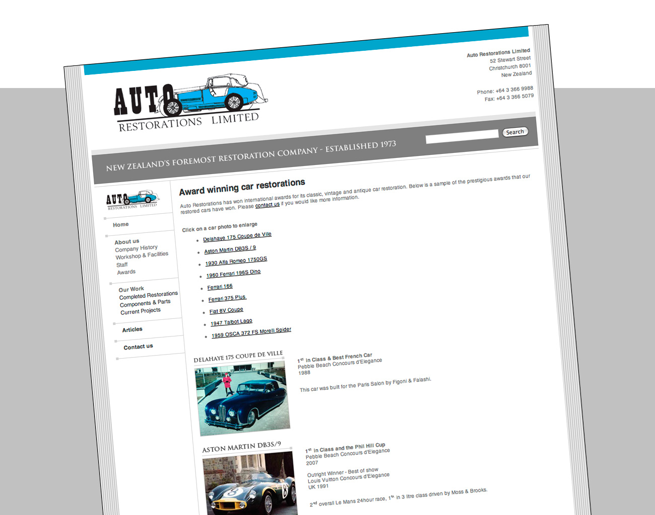 Established in 1973, Christchurch’s Auto Restorations has a story to tell. Every year it must mobilise new car restoration projects. To do this it relies on existing clientele, affluent, discerning people who might already know of the company by word of mouth, prestigious Concours D‘Elegance ‘First In Class’ wins, the publicity that generates in classic car enthusiasts’ media, their advertising, website and brochure—sales brochures, basically—designed to showcase the superior quality of the work they do. Showcase the process of restoration, the completed works, among them some of the most refined and rare cars in the world, and do it justice with advertising and promotional material that has the maximum effect and gives the impression to their select international clientele of an organization worthy of trusting one’s precious, valuable car to.